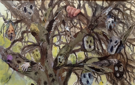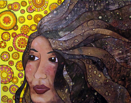 Kayann Ausherman In Toward the Light, a woman with long strands of dark hair moves toward the light, cheery and whimsical. The hair, melded from the many words of our thoughts like shame, regrets, guilt, fear, could hold the woman back, but instead, she strains toward the light and bright in an incongruous mix of styles.