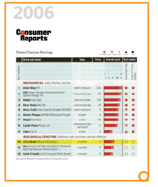 We've always maintained that our products are the best. But it sure doesn't hurt to have it backed up by Consumer Reports. In 2006 Citra Drain was rated the #1 biological drain maintainer by Consumer Reports |